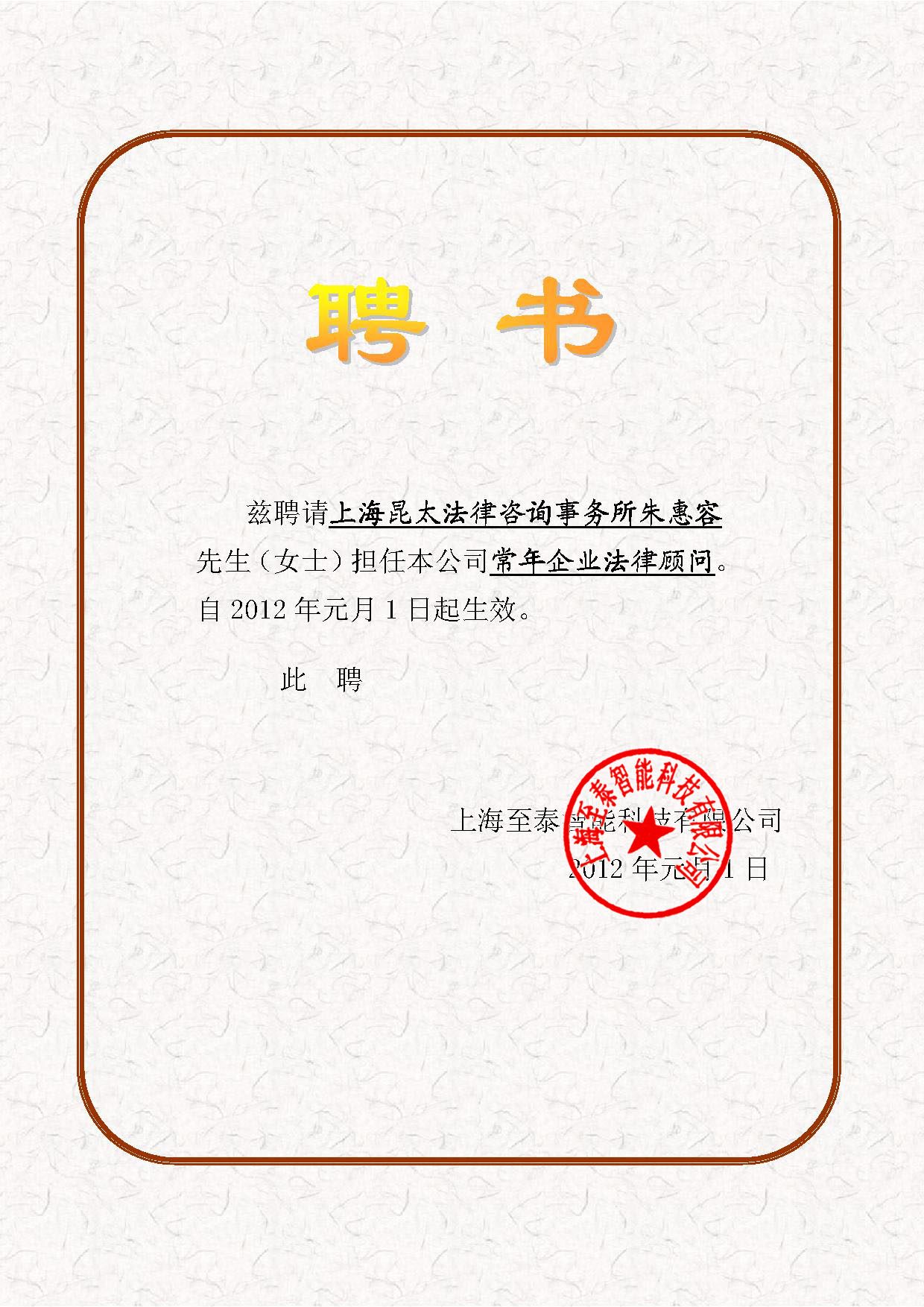 上海至泰智能科技有限公司 (本公司常年法律顧問單位-上海昆太法律咨詢事務所)